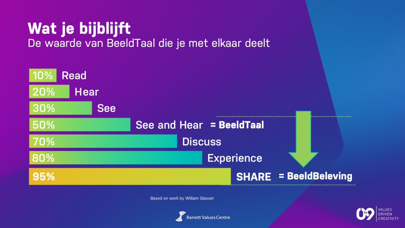 Volgens het werk van Edgar Dale / William Glasser wordt datgene wat men ziet, veel beter onthouden, dan wat men leest of hoort. In onderstaand schema staat dat we slechts 10% onthouden van wat we lezen. Dit loopt op naar 20% als we informatie horen, 30% als we iets zien en 50% als we iets horen én zien. Daarom maken wij creatieve concepten die al deze zintuigelijke aspecten raken. Maar, zoals ook uit het schema blijkt: het kan nog beter!