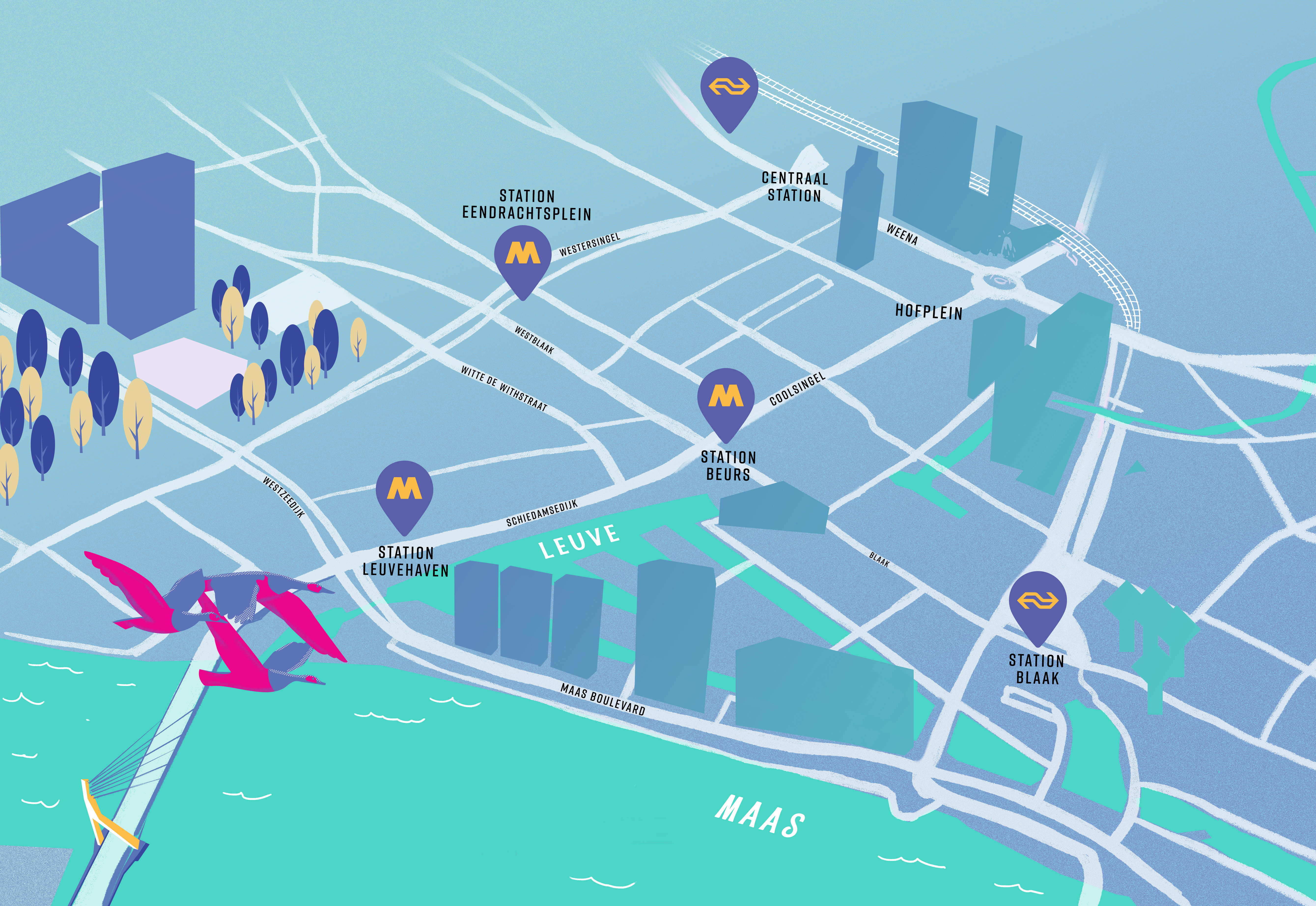 De Leuve ligt op ongeveer 20 minuten lopen van Rotterdam CS. Loop vanaf het Stationsplein richting Centrum. Ga op het Weena linksaf en loop door tot de stoplichten na de Delftse Poort. Ga rechtsaf (tweemaal oversteken) en loop de Karel Doormanstraat uit. Steek over op de Westblaak en sla linksaf. Sla op de kruising met de Coolsingel rechtsaf de Schiedamsedijk in. Schuin tegenover het Maritiem Museum vind je De Leuve. Heb je nog vragen of ben je verdwaald, bel even naar +31 10 27 59 000. We helpen je graag onderweg.