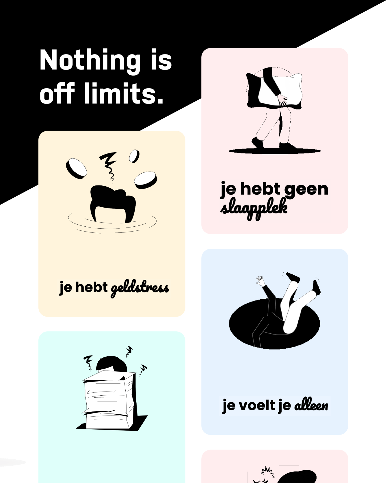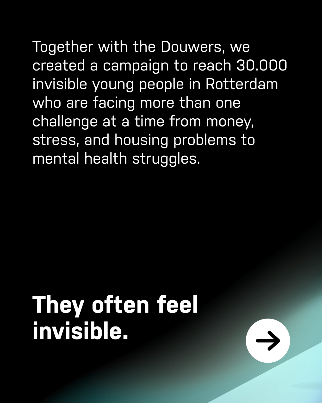 Samen met de Rotterdamse Douwers lanceerden we een campagne voor 30.000 jongeren die kampen met geldstress, huisvestingsproblemen of psychische zorgen en zich onzichtbaar voelen. Op Altijdiemanddiejeziet.nl vind je altijd iemand die luistert, anoniem en zonder oordeel.
