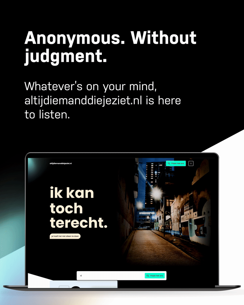 Wij maakten de drempel voor de hulpzoekende jongeren zo laag mogelijk. Met onderzoek en sessies met jongeren hebben we een zo duidelijk mogelijk beeld gekregen van wat voor hen belangrijk is. Zo bleek bijvoorbeeld dat anonimiteit belangrijk is. Dat bieden we dus. Daarbij ondersteunen we hen met een heldere interface, een makkelijke chatfunctie en duidelijke taal die jongeren aanspreekt. Zo kunnen ze snel actie ondernemen, met de zekerheid dat er altijd iemand voor hen beschikbaar is.
