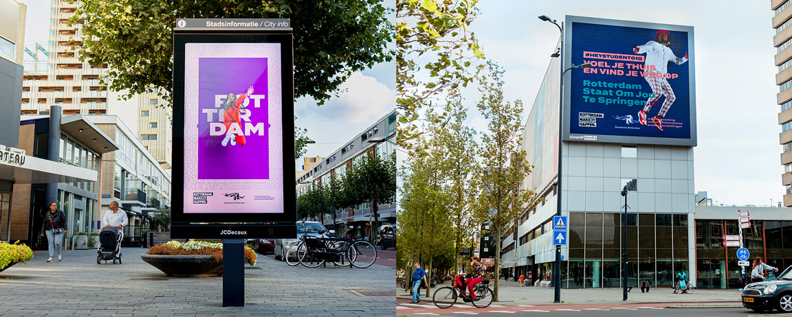 We kozen voor een positieve, enthousiaste en laagdrempelige aanpak waarin we Rotterdam neerzetten als de studentenstad van nu. Een stad waar ruimte is voor wie je bent en kunt worden wie je bent. De opvallende bewegende uitingen waren niet te missen voor alle nieuwe studenten, overal staan we om studenten te springen… en dat was te zien: all over town!