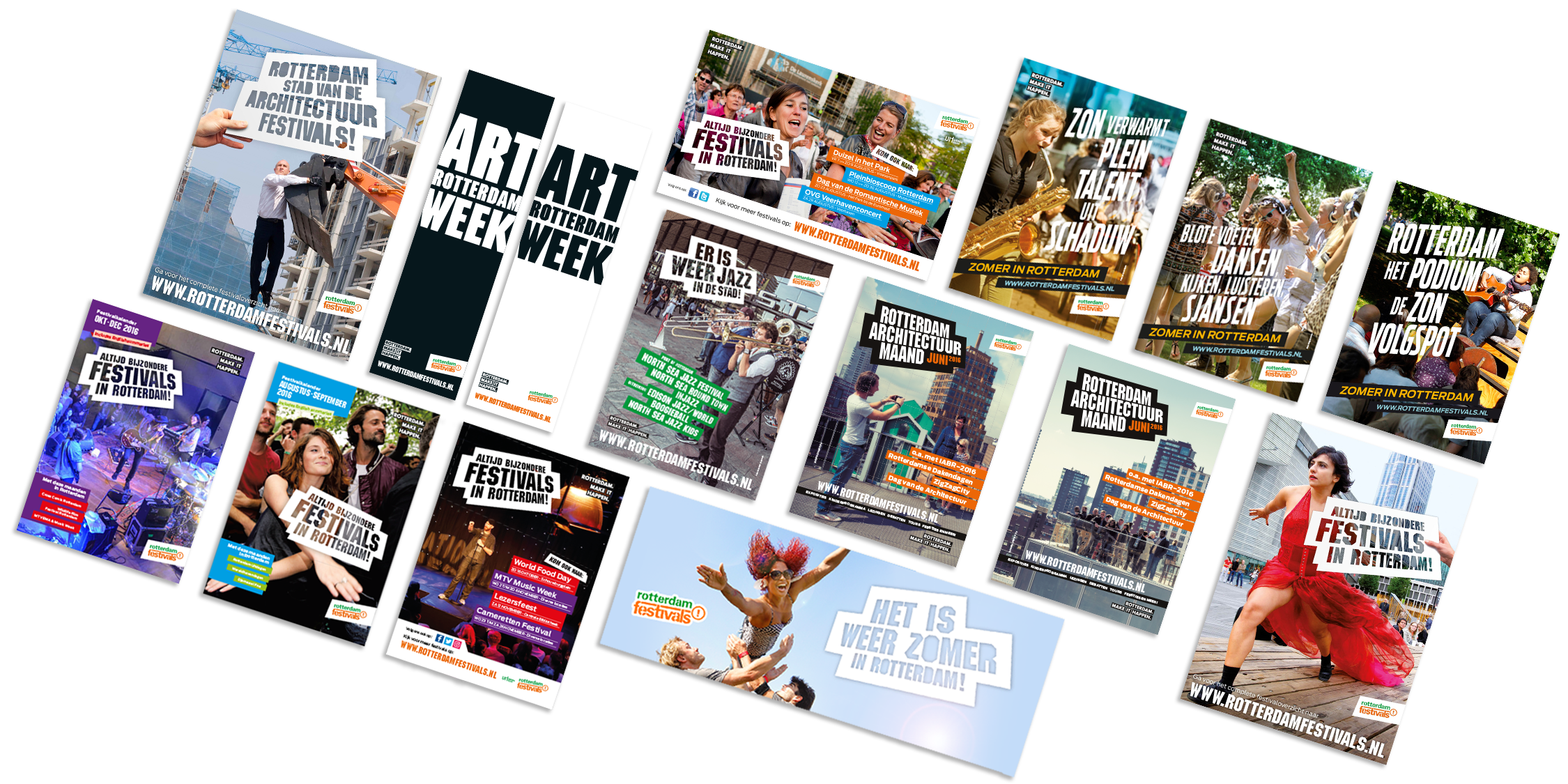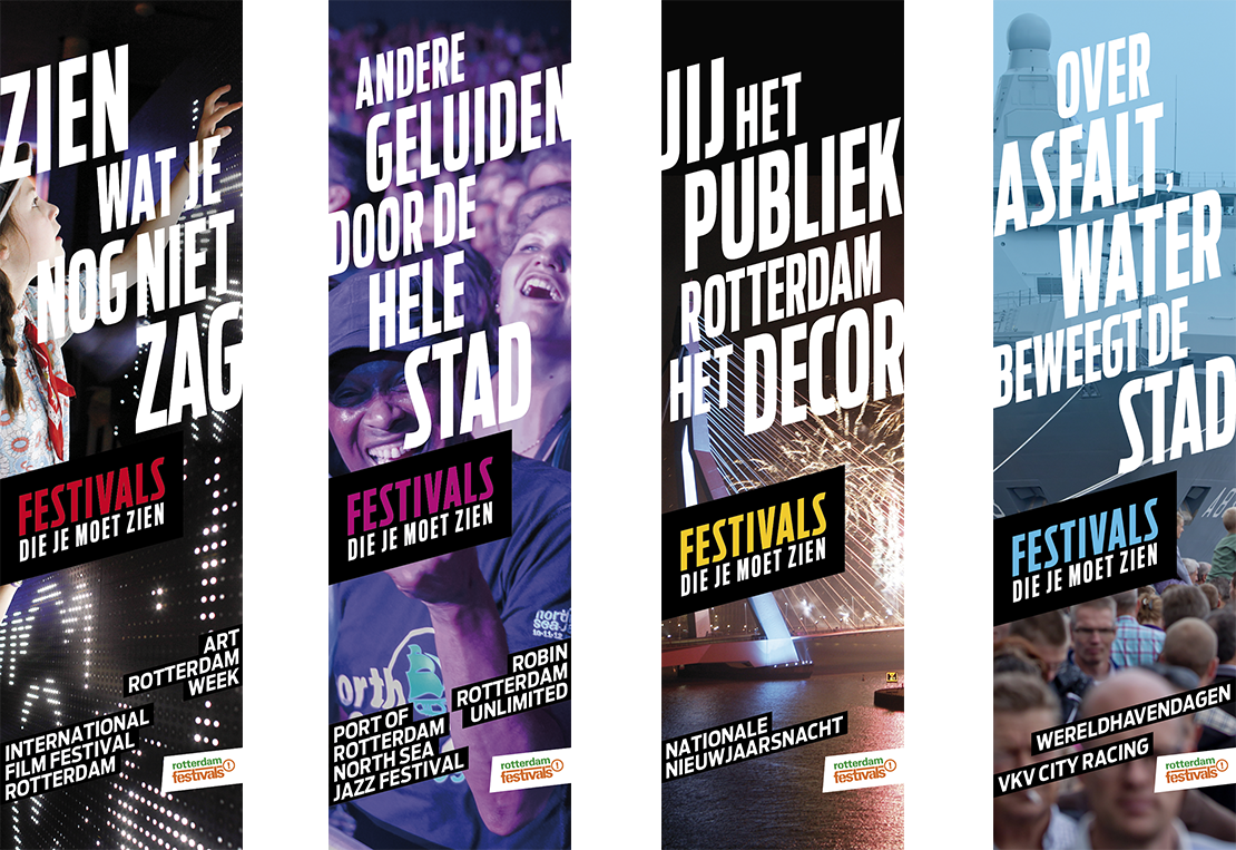 De campagnes, advertenties, festivalkalenders hebben een herkenbare lijn met bijzondere fotografie. Iedereen herkent direct de stijl van Rotterdam Festivals.