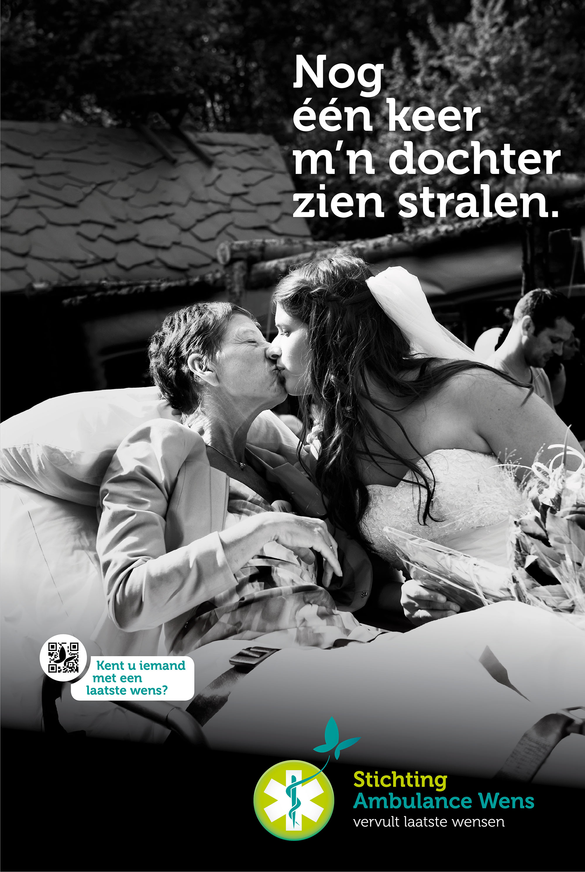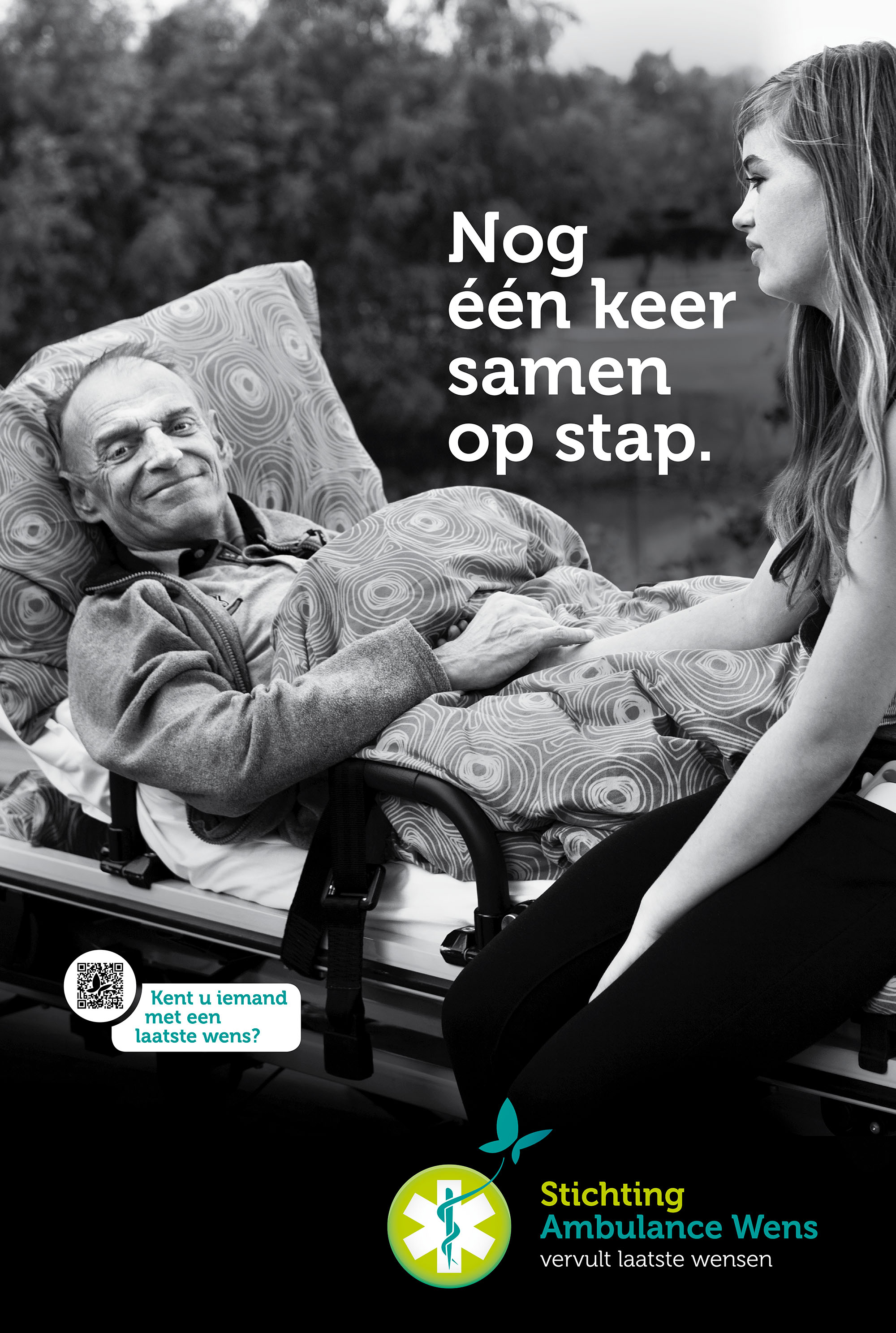 Jaarlijks kiezen wij een goed doel waar we belangeloos voor werken. Toen we hoorden van Stichting Ambulance Wens, een stichting die laatste wensen van terminale patiënten in vervulling laat gaan, raakte ons dat diep. Niet alleen door de inzet van oprichter Kees Veldboer en zijn 190 vrijwilligers, maar vooral ook door de verhalen die zij ons vertelden. Het creatieve proces was daardoor heel mooi maar soms ook emotioneel. We hebben best wat traantjes weggepinkt. Het ontroerde ons hoe klein laatste wensen vaak zijn. Nog één keer een nachtje thuis slapen, nog één keer de zonsondergang zien, nog één keer je dochter zien stralen op haar bruiloft. Kleine wensen met een grote waarde.